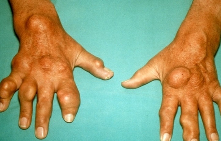 보통 통풍이 심한 간 환자들의 대표적인 사진들이 만성 결정성 통풍이다. 손과 발이 괴상한 형태로 변해 구부러지고 결절이